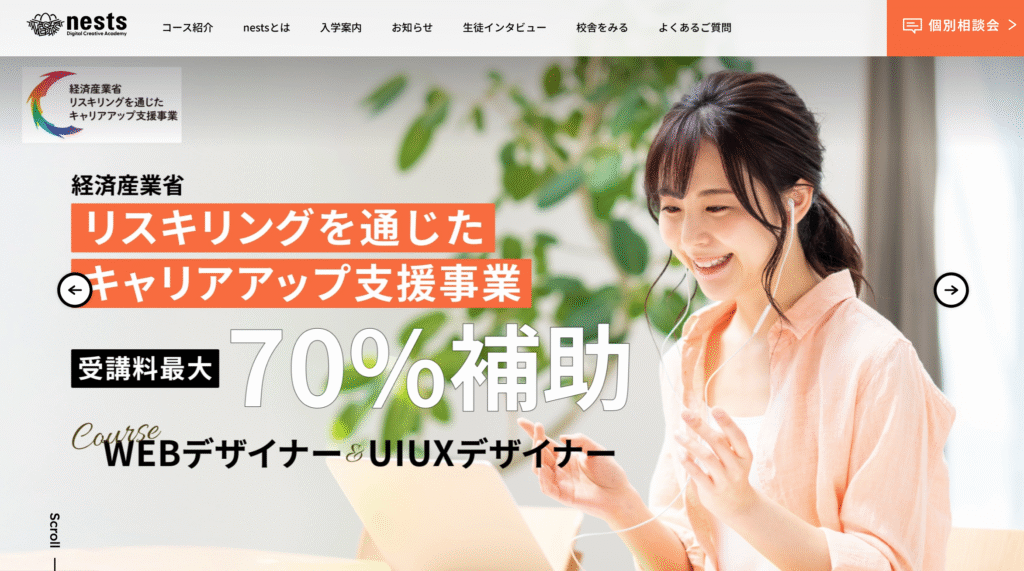 nests(ネスト)は、制作会社がプロデュースするWebデザインスクールで、業界直結のカリキュラムとサポート体制が特徴です。