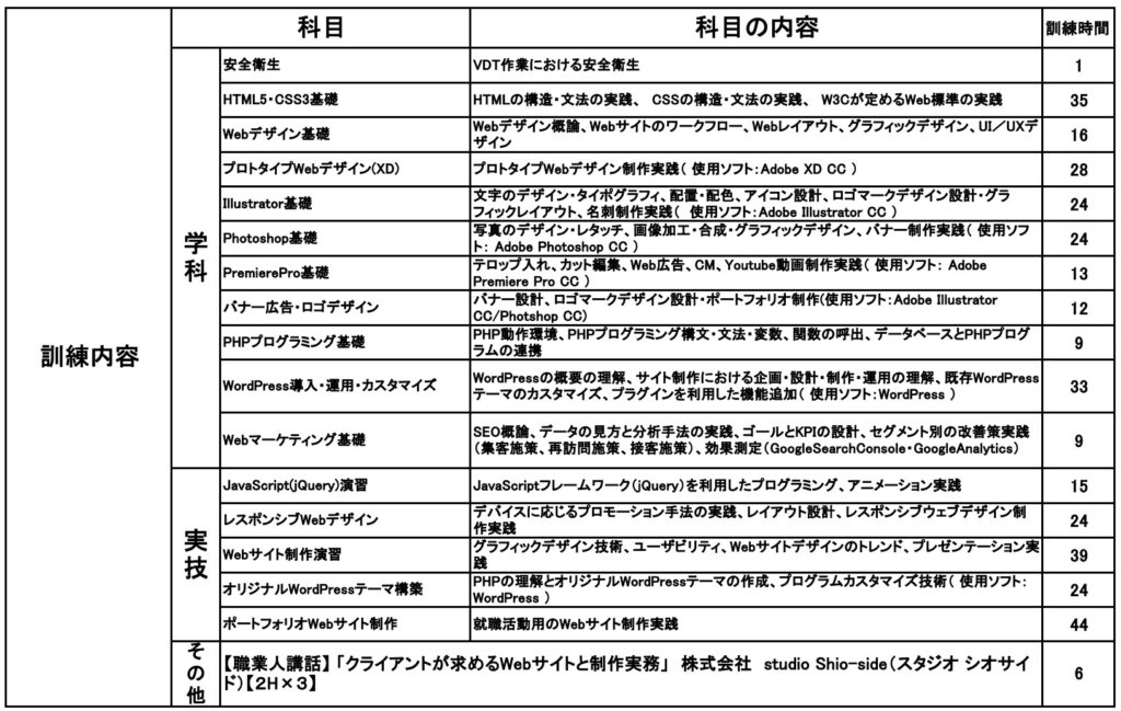 一部抜粋ですが、とある職業訓練のカリキュラムを紹介すると以下のような内容となっています。
