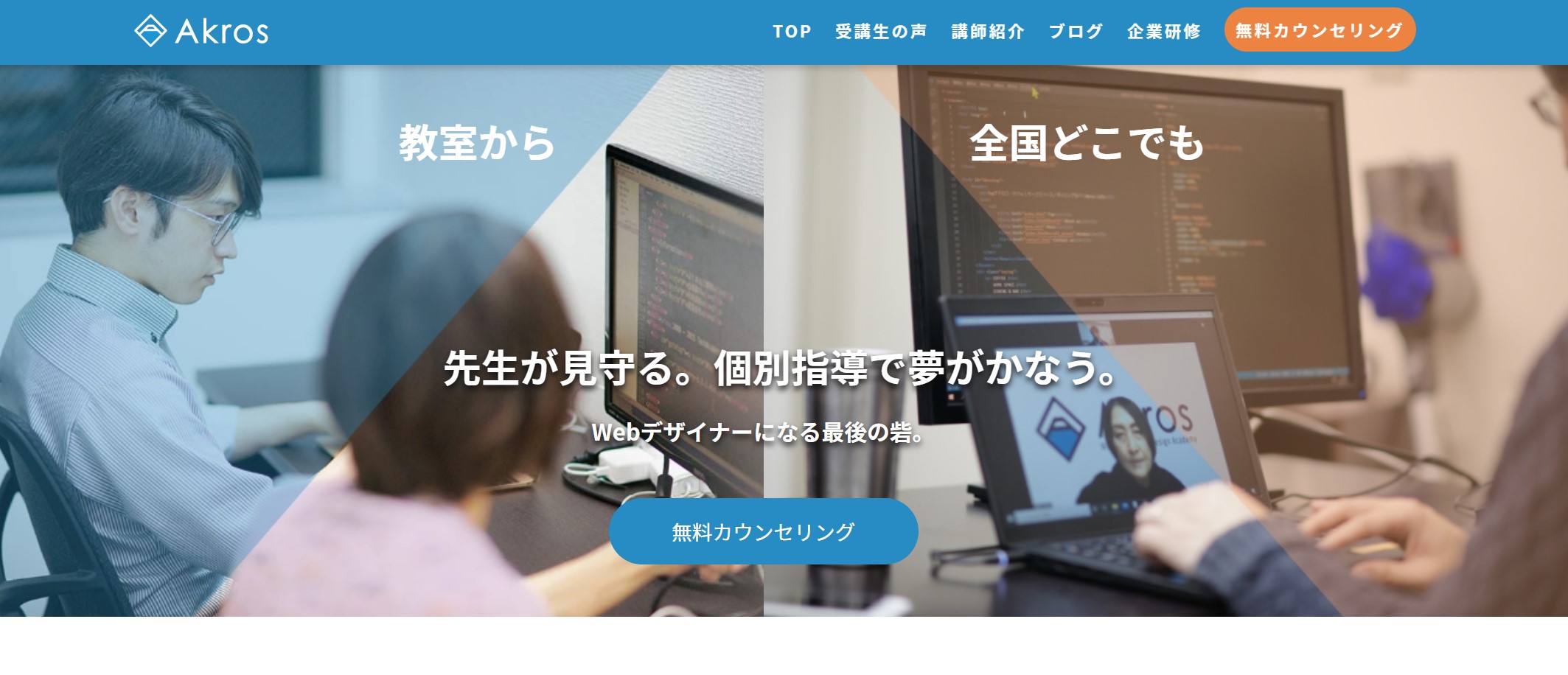ぜひおすすめしたいスクールですが、現在は新規受講生受付を中止しています。これから学習を始めたいと考えている方は、Akrosの状況を確認しながら、その他のスクールも並行して自分に合ったスクールを探し始めましょう。
