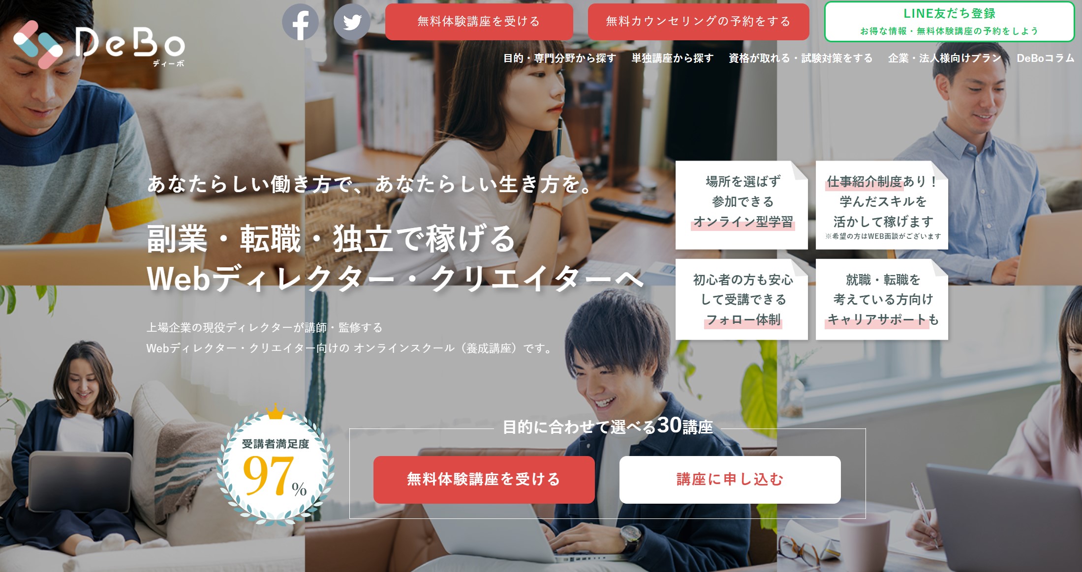 DeBo(ディーボ)は、副業・転職・独立で稼げるWebディレクターやクリエイターを目指す方向けのオンラインスクールです。