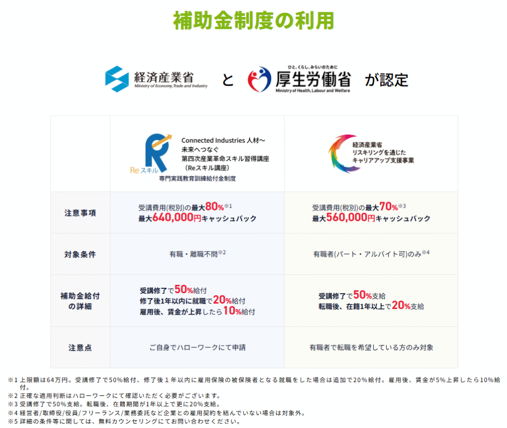 また、リスキリング補助金や専門実践教育訓練給付金を活用すれば、実質25万円前後で受講できるのも魅力。費用面での不安を抑えながら、安心してスキル習得を進められます。