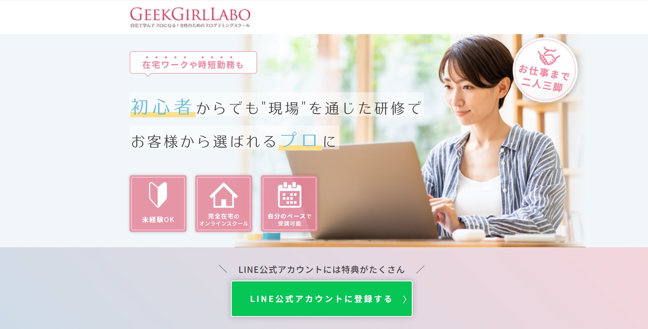 Geek Girl Labo(ギークガールラボ)はさまざまなライフスタイルを生きる女性、特に30代前後の子育てママに人気のあるプログラミングスクール。