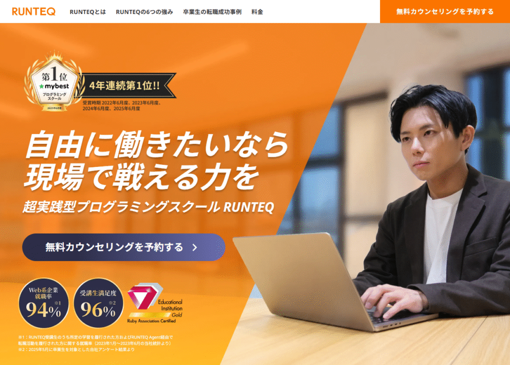 RUNTEQは「現場で即戦力となるための圧倒的な技術力」として知られており、98%の高い就職・転職率(2023年実績)も誇っています。