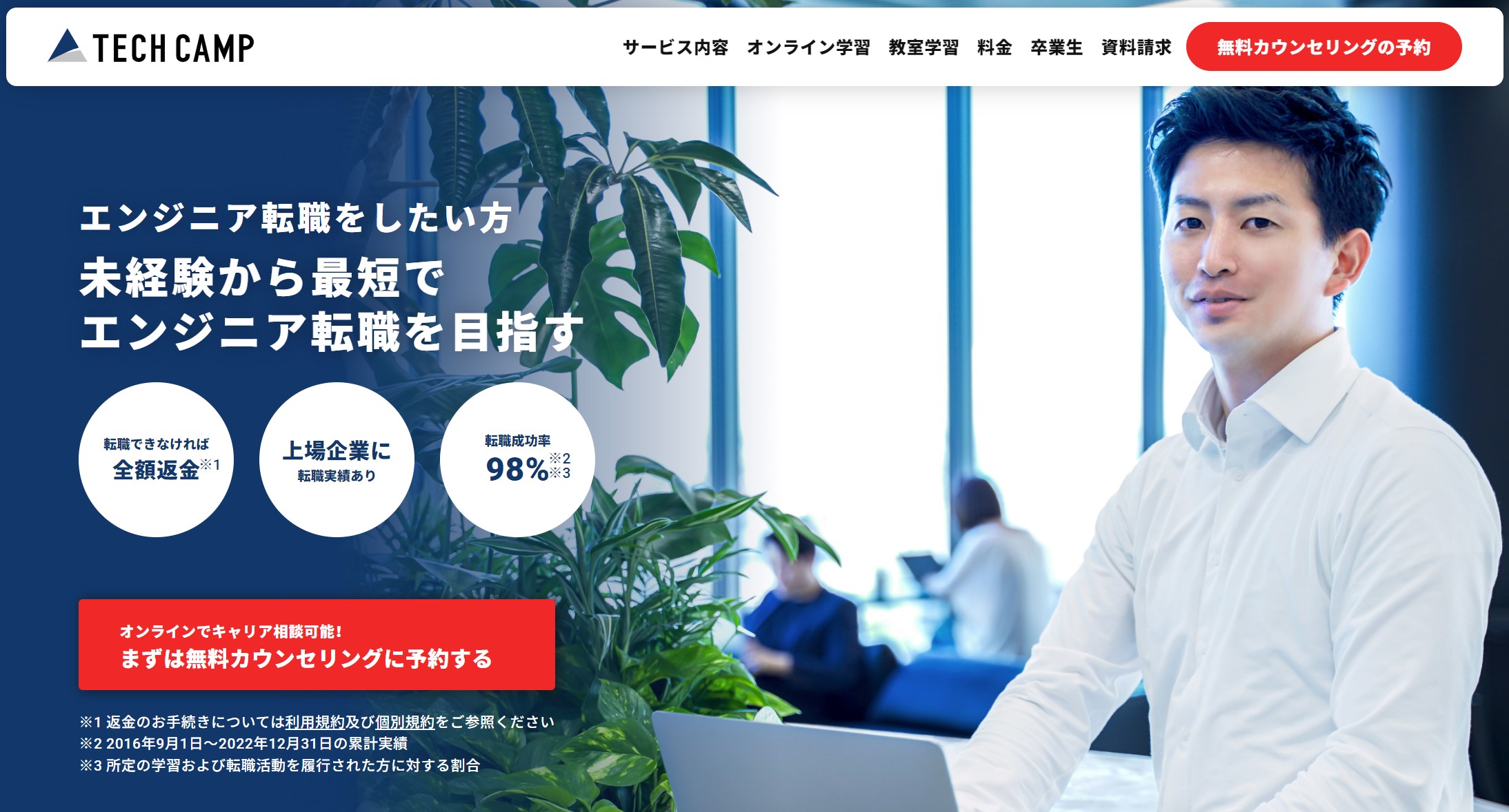 テックキャンプはエンジニアとして就職や転職を目指している人向けのプログラミングスクールです。
