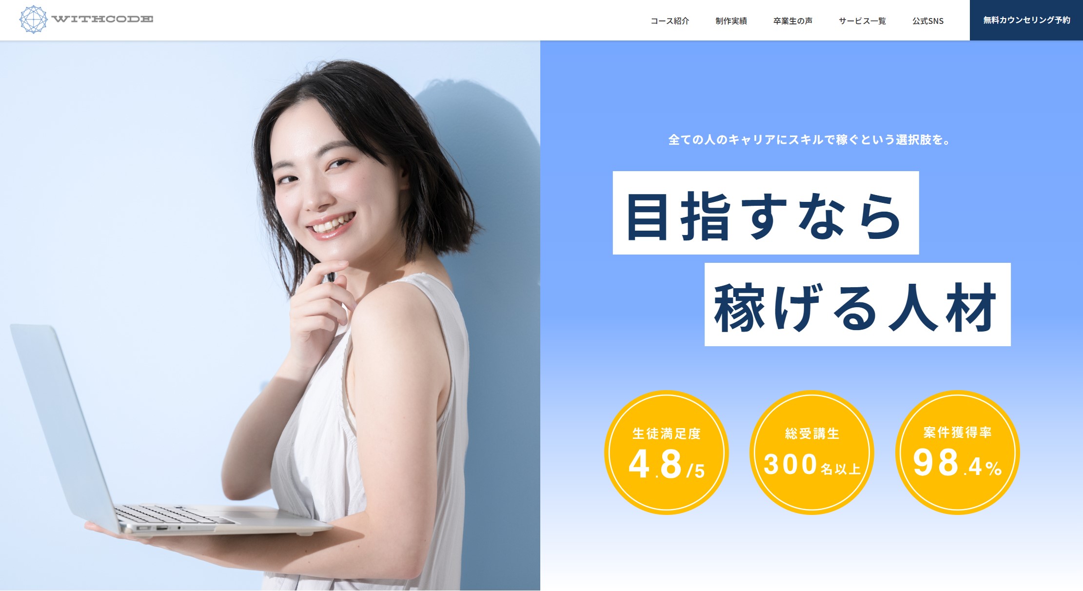 Web制作スキルを本気で身につけたい方、そのスキルを実際の収入に結びつけ、新たなキャリアを目指したい方には、WithCodeが向いているかもしれません。